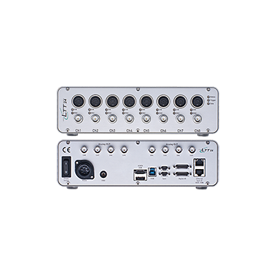The LTT24 mains adapters work highly synchronously at half the ADC clock speed and thus remain invisible over the total bandwidth from DC to 2 MHz. The common mode rejection of the differential amplifiers – crucial for the suppression of external, typically high-frequency stray pick-up from the sensor cables – allows adjustment from DC to more than 1 MHz bandwidth at the touch of a button, and this better than -100 dB. All measurement channels (such as voltage, current, resistance, ICP, LVDT, strain gauge, charge) are galvanic isolated and provide stable sensor supply up to the MHz range – in fact, more precisely than the measurement resolution of